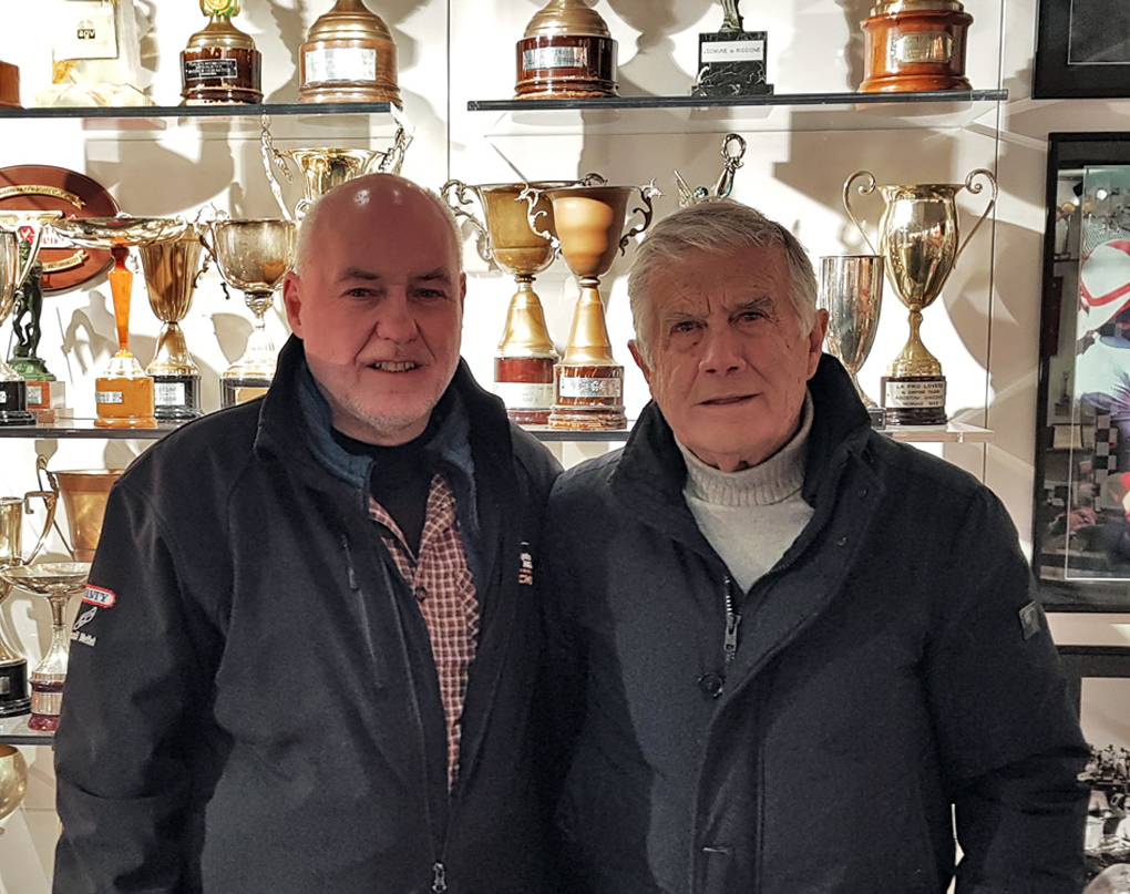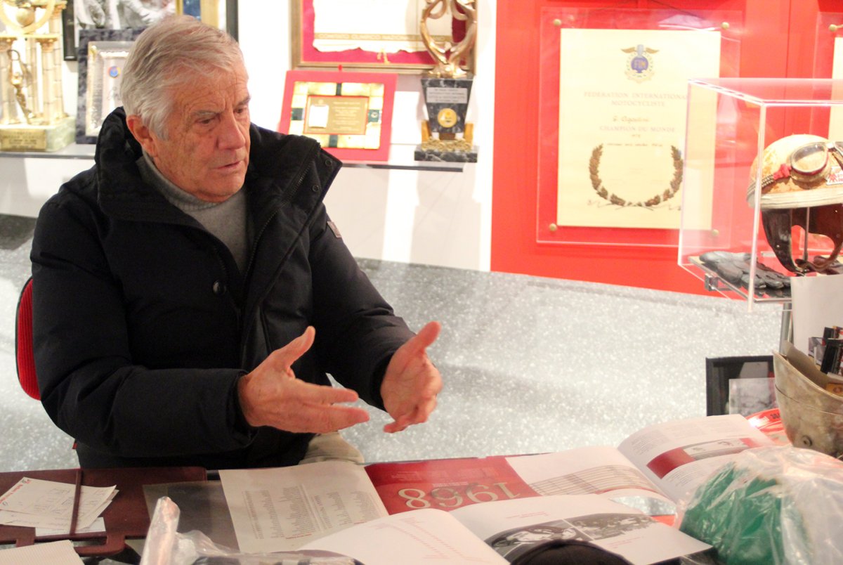 Giacomo AGOSTINI découvre la maquette du livre "Le Roi aux 15 Couronnes".