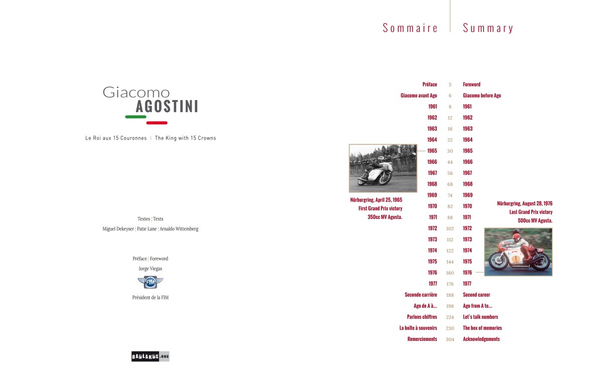 Année où Giacomo Agostini fêtera son 80e anniversaire. Quoi de plus beau pour fêter l'événement que de réaliser un livre sur l'homme aux 15 titres de Champion du Monde ?
